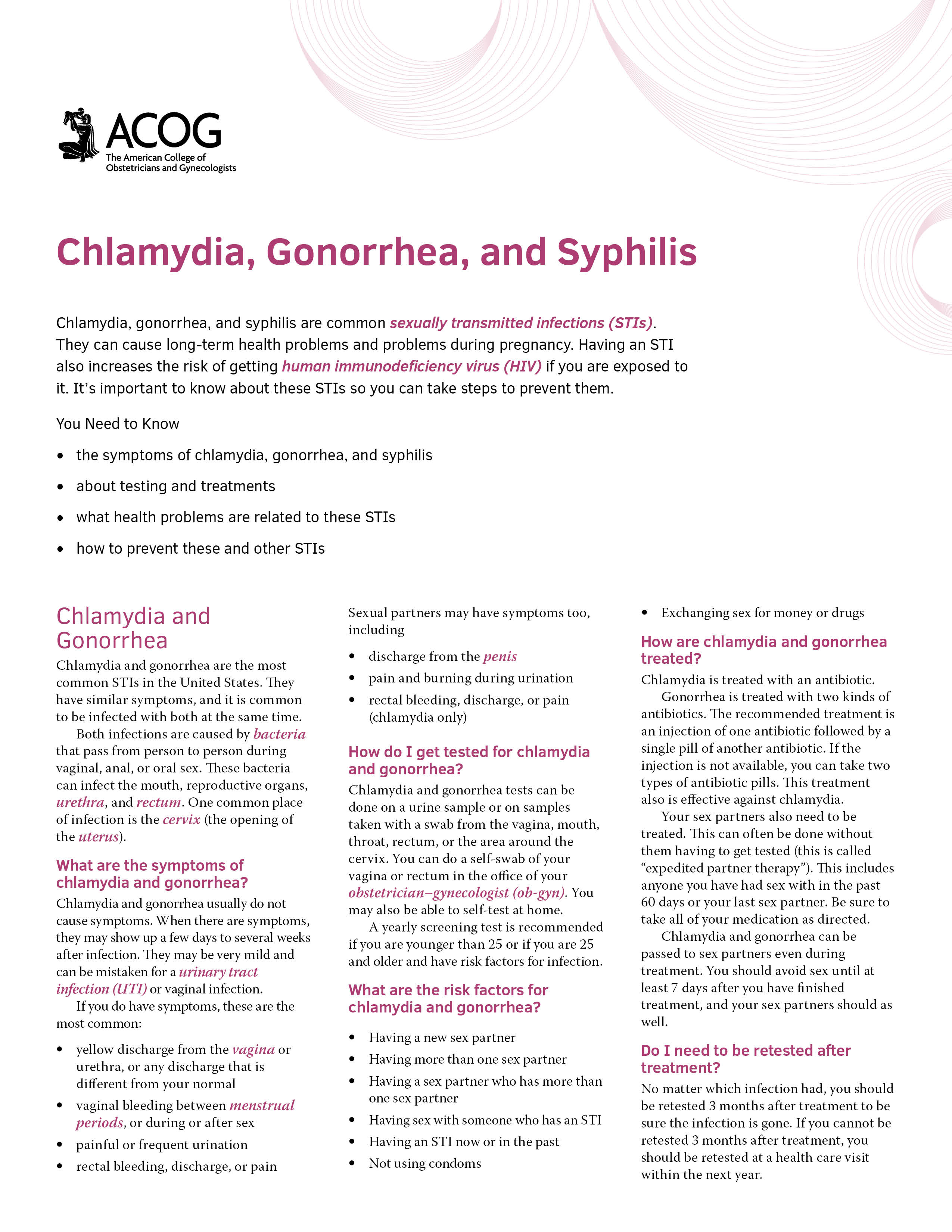 The Chlamydia, Gonorrhea and Syphilis pamphlet offers important information to patients about these sexually transmitted infections (STIs). The concise and easy-to-understand content includes: