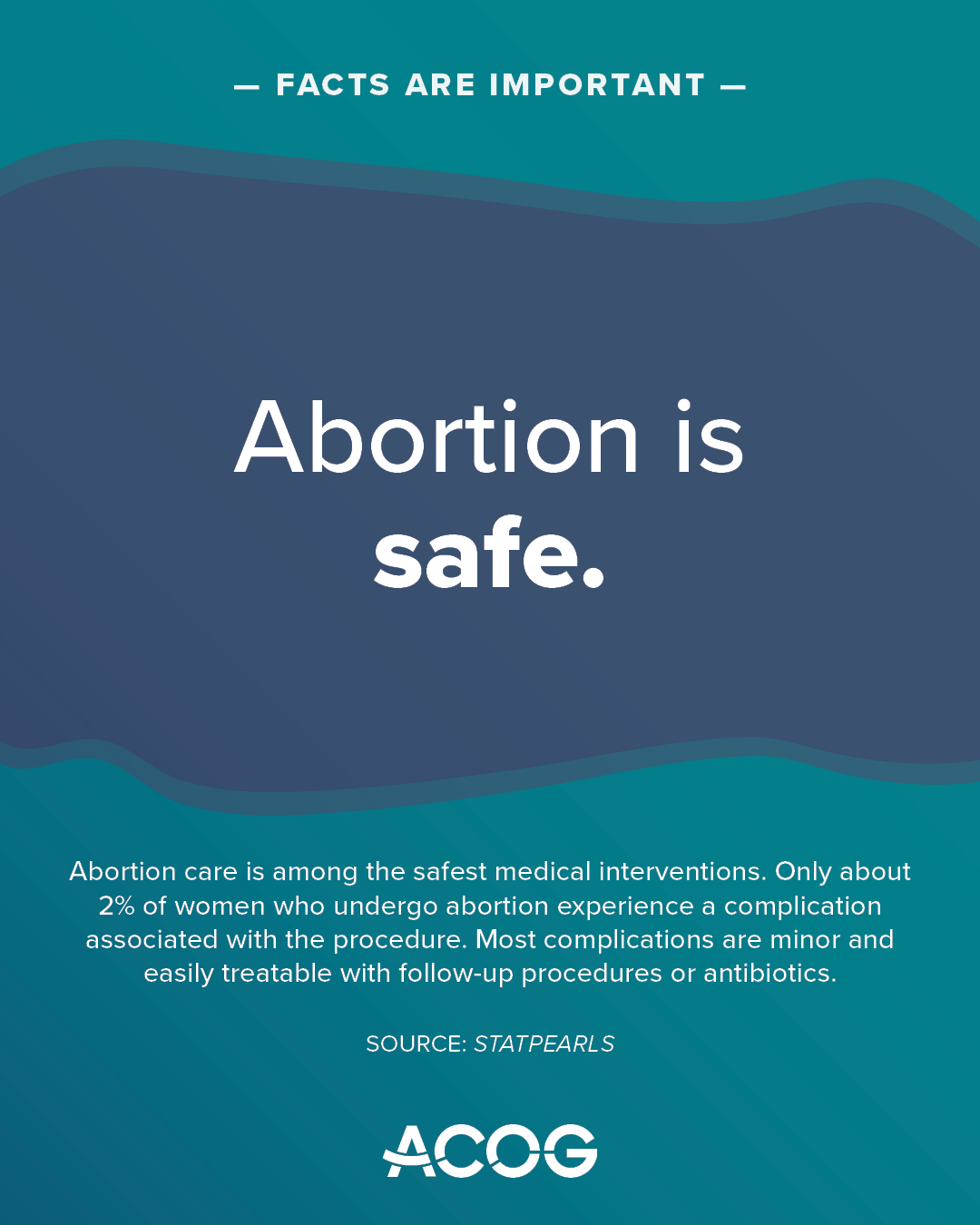 Image text: Abortion care is among the safest medical interventions. Only about 2% of women who undergo abortion experience a complication associated with the procedure. Most complications are minor and easily treatable with follow-up procedures or antibiotics.