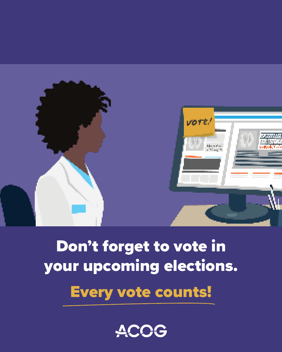 Ob-gyns: your upcoming elections are crucial for our profession and our patients. By voting, we can influence policies that shape our patients’ health and their access to care. Let’s use our voices to make change for the better! #ObGynsVote #Vote #HealthCareAdvocates