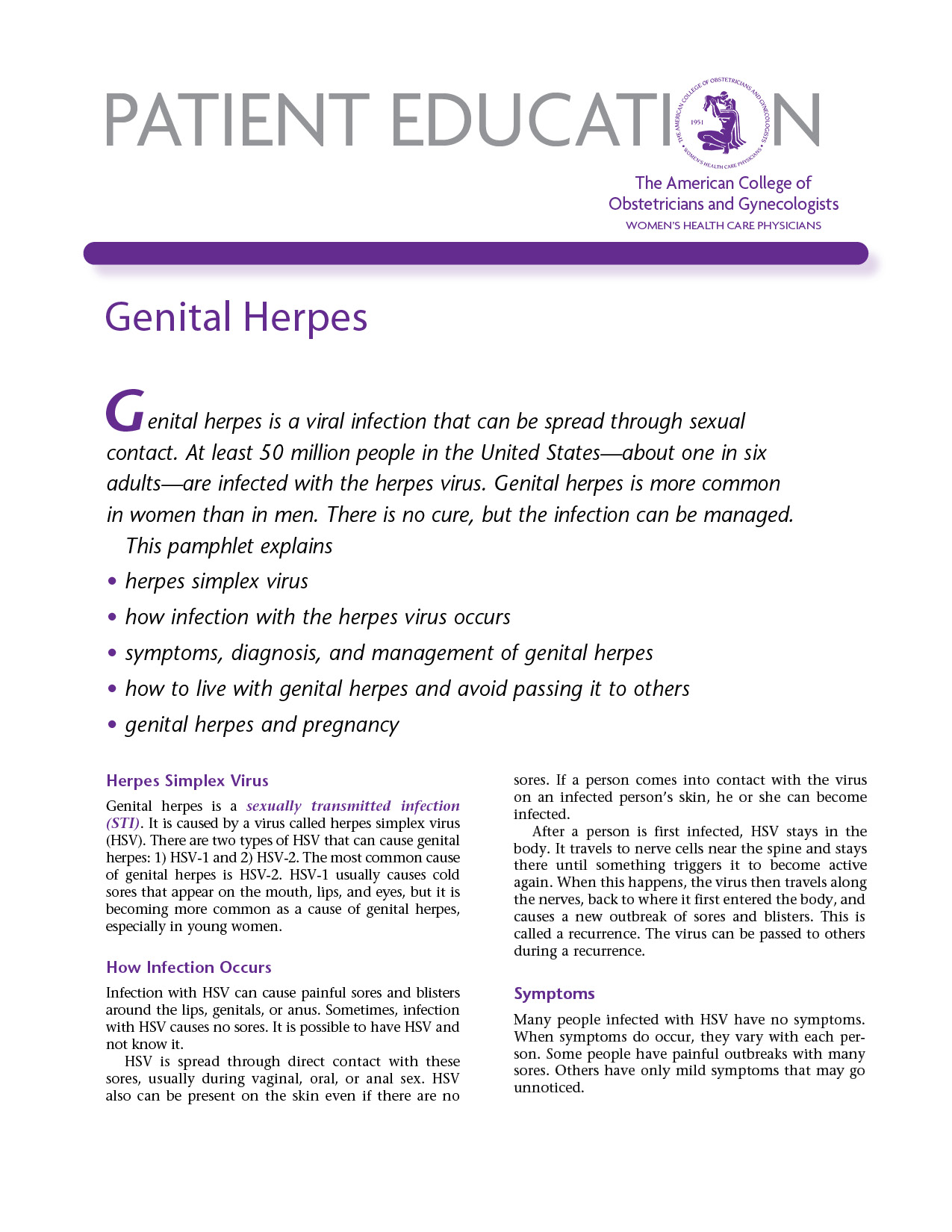 The Genital Herpes pamphlet offers concise and easy-to-read information for your patients. Focusing on common patient concerns, content includes: