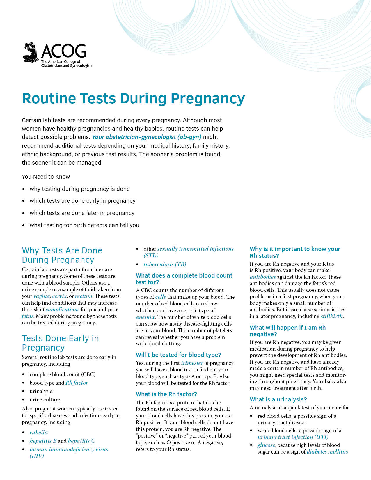 The Routine Tests During Pregnancy pamphlet offers important information about testing for your pregnant patients. This resource covers: