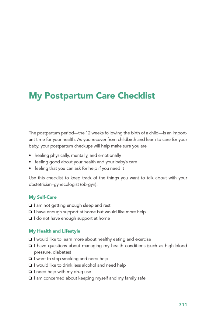 - A checklist for tracking symptoms or concerns during the postpartum period